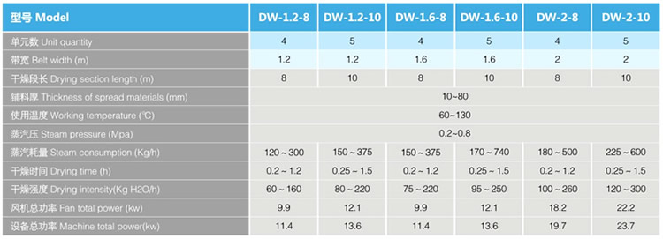 物料由加料器均勻地鋪在網(wǎng)帶上,網(wǎng)帶一般采用12—60目不銹鋼絲網(wǎng),由傳動裝置拖動在干燥機內(nèi)移動。干燥機由若干單位組成,每一單元熱風獨立循環(huán),部分尾氣由專門排濕風機排出,廢氣由調(diào)節(jié)閥控制,熱氣由下往上或由上往下穿過鋪滿物料的網(wǎng)帶完成熱量與質(zhì)量傳遞的進程,帶走物料水份。網(wǎng)帶緩慢移動,運行速度可根據(jù)物料溫度自由調(diào)節(jié),干燥后的成品連續(xù)落入收料器中。上下循環(huán)單元根據(jù)用戶需要可靈活配備,單元數(shù)量可根據(jù)需要選取。技術參數(shù)