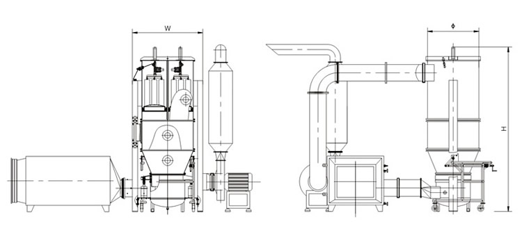 該機由主機、空氣處理系統(tǒng)、加熱系統(tǒng)、控制系統(tǒng)等組成。工作時,物料加入沸騰干燥機的料倉,按工藝要求設(shè)定程序和參數(shù),整機開始工作。空氣經(jīng)過空氣處理系統(tǒng)過濾、經(jīng)加熱系統(tǒng)加熱后進入主機內(nèi),物料經(jīng)熱空氣流化、干燥,水份迅速蒸發(fā),物料被快速干燥。按設(shè)定的程序與參數(shù)完成操作后,將料倉推出與YTZ系列固定提升轉(zhuǎn)料機扣合提升出料或利用真空上料器抽到高位整粒機整粒,有效地控制粉塵與交叉污染。