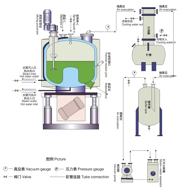 本機(jī)主要依靠來(lái)自容器底部的激振器所產(chǎn)生的機(jī)械振力和激振力矩,使容器產(chǎn)生周期性的振動(dòng)。由于容器底部為一圓環(huán)形狀,各點(diǎn)的振幅不一,使容器內(nèi)的物料即圍繞容器中心軸線公轉(zhuǎn),又繞圓環(huán)中心翻滾,合成環(huán)形螺旋運(yùn)動(dòng),從而達(dá)到流化狀態(tài)。流化物料與夾套加熱的容器內(nèi)壁接觸傳熱升溫,達(dá)到汽化點(diǎn)后在真空下水份汽化外排,致使物料快速脫水干燥。流程圖