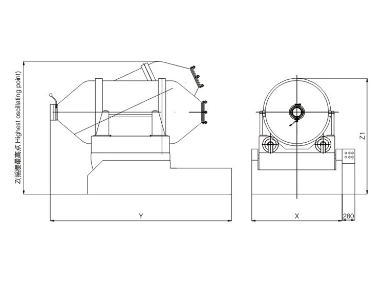 EYH系列二維運動混合機的轉(zhuǎn)筒可同時進行二個運動,一個為轉(zhuǎn)筒的轉(zhuǎn)動,另一個為轉(zhuǎn)筒隨擺動架的擺動。被混合物料在轉(zhuǎn)筒內(nèi)隨轉(zhuǎn)筒轉(zhuǎn)動、翻轉(zhuǎn)、混和的同時,又隨轉(zhuǎn)筒的擺動而發(fā)生左右來回的摻混運動,在這兩個運動的共同作用下,物料在短時間內(nèi)得到充分的混合。EYH二維混科機適合所有粉、粒狀物料的混合。外型示意圖