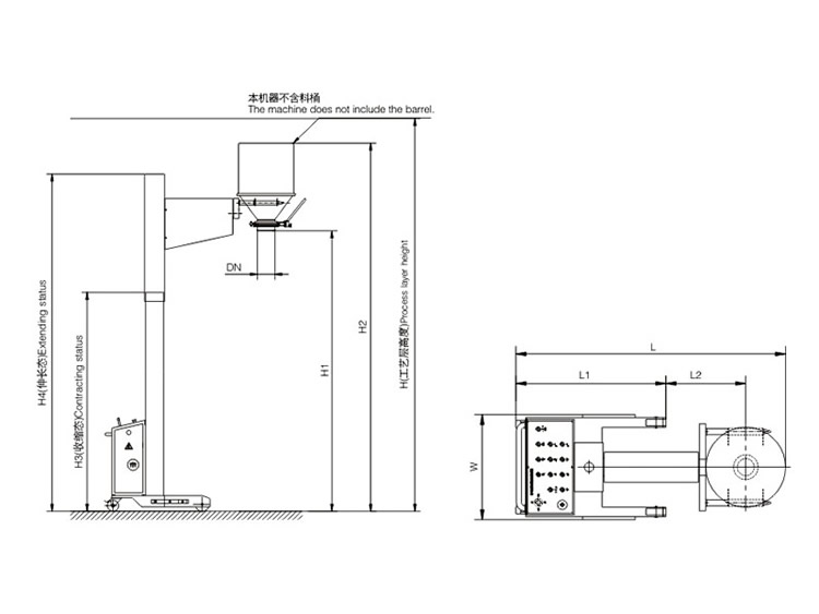 該機(jī)主要由底盤小車、伸縮系統(tǒng)、提升系統(tǒng)、翻轉(zhuǎn)系統(tǒng)等組成。工作時(shí),先將錐斗與料桶扣合,然后啟動(dòng)提升按鈕,料桶提升;啟動(dòng)翻轉(zhuǎn)拄鈕,料桶即可翻轉(zhuǎn)180°。移動(dòng)底盤小車與加料的設(shè)備密閉對(duì)接,開啟出料蝶閥,使物料密閉轉(zhuǎn)移到下一工序。特點(diǎn)
