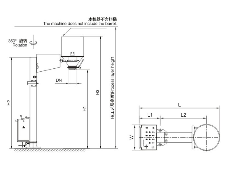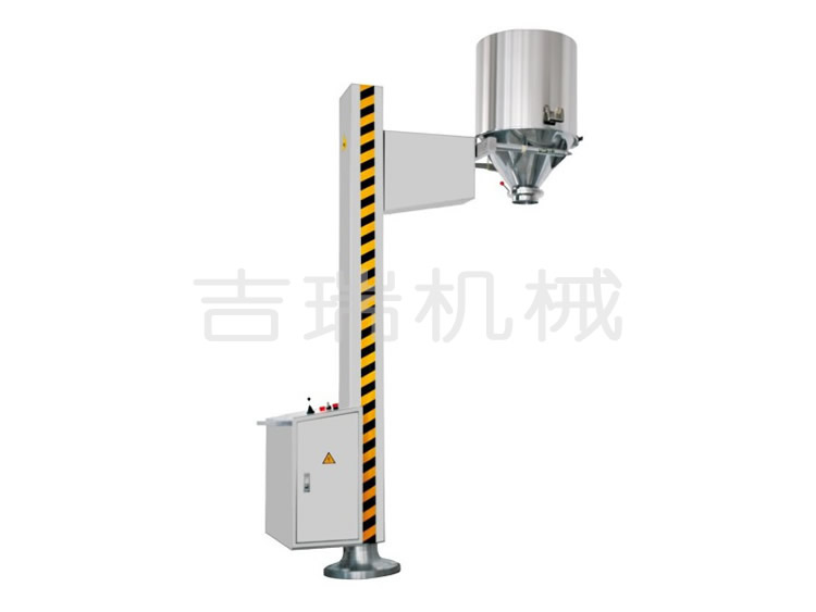 該機主要由底盤、立柱、提升系統(tǒng)、翻轉(zhuǎn)系統(tǒng)等組成。工作時,先將錐斗與料桶扣合,然后啟動提升按鈕,料桶提升;啟動翻轉(zhuǎn)按鈕,料桶即可翻轉(zhuǎn)180°。旋轉(zhuǎn)立柱與加料的設(shè)備密閉對接,開啟出料蝶閥,使物料密閉轉(zhuǎn)移到下一工序。特點
