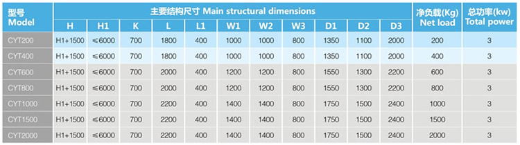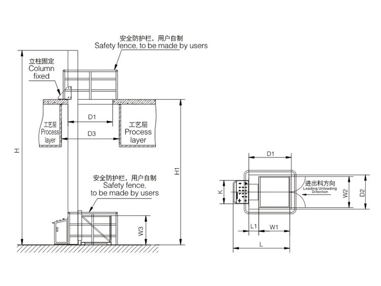 該機(jī)主要由底盤、立柱、提升系統(tǒng)等部件組成。工作時(shí),先將物料裝入或料斗推入提升平臺上,然后拄下提升按鈕,平臺提升,平臺到位后搬出物料或推出料斗到所需的位置。特點(diǎn)